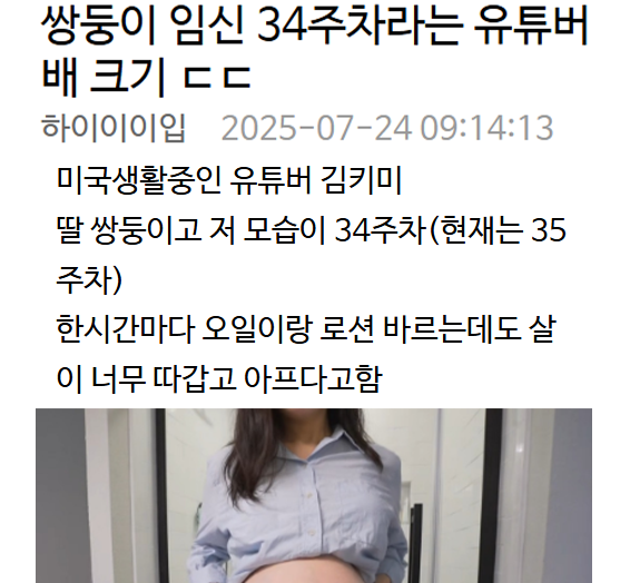 쌍둥이 임신 34주차라는 유튜버 배 크기 ㄷㄷ