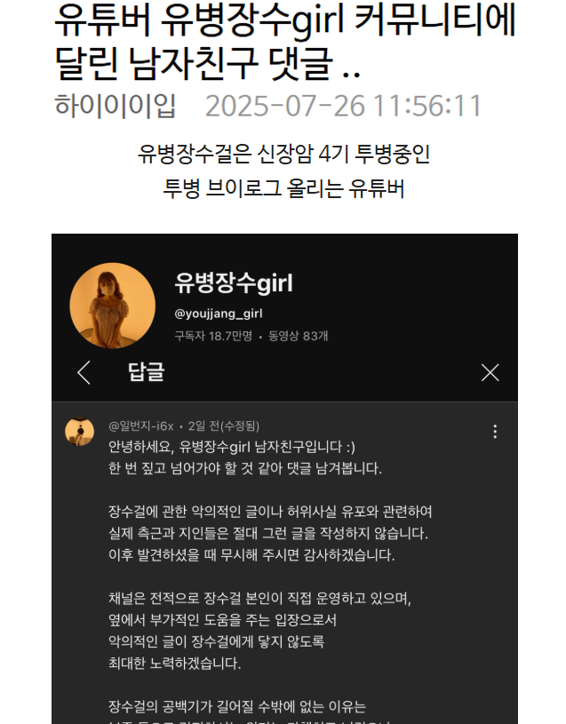 유튜버 유병장수girl 커뮤니티에 달린 남자친구 댓글 ..